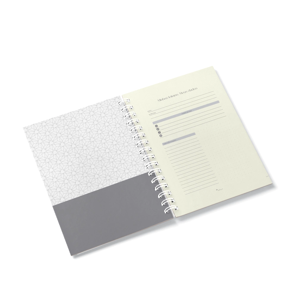 - Acabamento da capa (Planner Minimalista): Escritos e em hotstamping dourado, aplicações do fundo em verniz localizado;